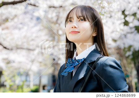 桜の中を歩く女子高生