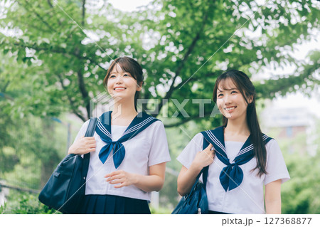 緑豊かな公園を通学する女子高校生 登下校通学