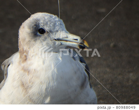 くちばしに釣り糸が絡まって顔がゆがんだウミネコ