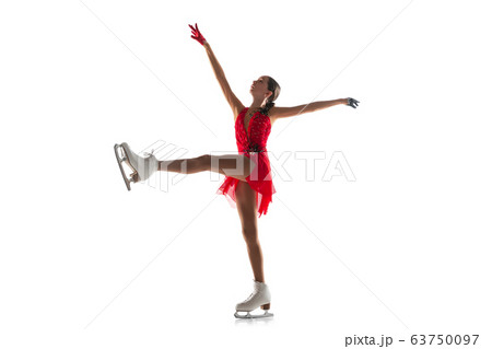 Beautiful girl in red dress, professional figure skater performing on dance competition, skating on 3D arena, ice rink. Graceful beauty