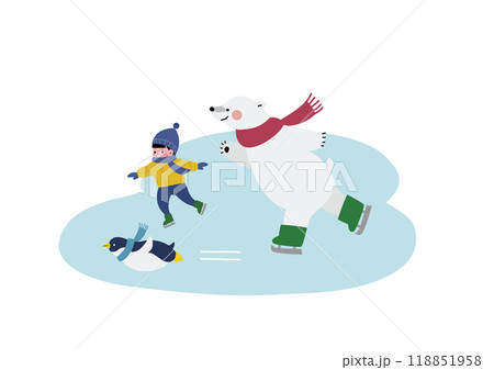 スケートをする白熊のイラスト。雪の結晶、冬、ホッキョクグマ、シロクマ