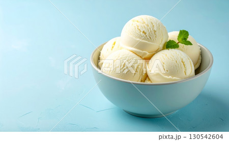 A single scoop of vanilla ice cream in a glass bowl