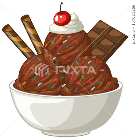 Chocolate Ice Cream Sundae and Waffle with Strawberry Toppings Vector Illustration