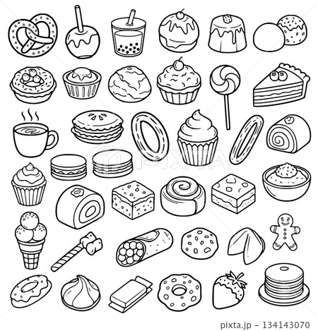 A comprehensive black and white line-art illustration featuring a large collection of various desserts, sweets, baked goods, and confectioneries, such as cakes, cookies, ice cream, pretzels, and candi