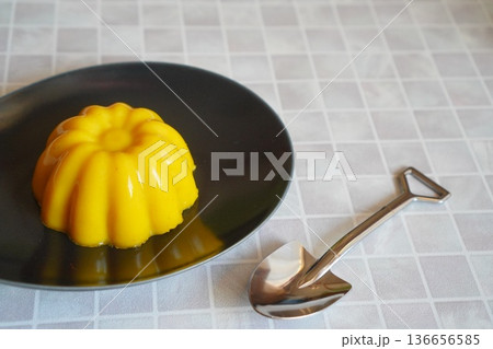 黒皿にのせた黄色いゼリーと可愛いスコップスプーン