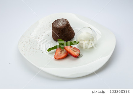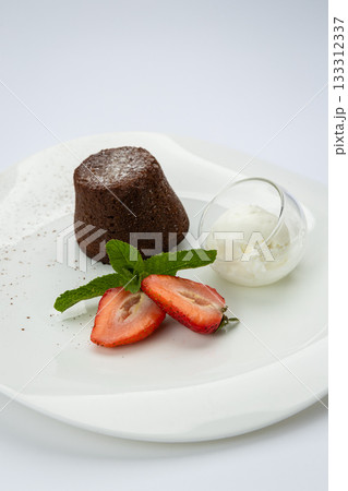 Chocolate lava cake with vanilla ice cream and strawberries on white plate, top view