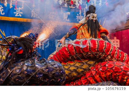 [国内] 神道の石見神楽で活躍する大蛇の人形のクローズアップ撮影。