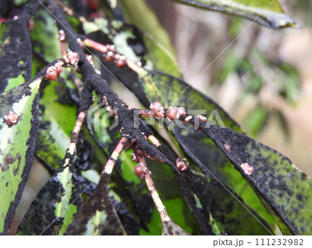 月桂樹に寄生したルビーロウカイガラムシ