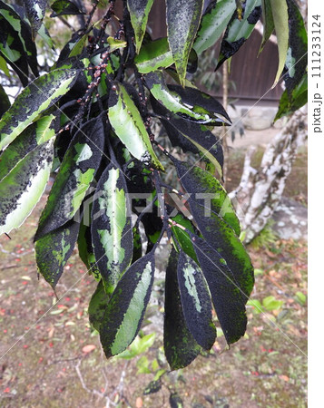 ナナミノキに付着したすす病による黒い汚れ
