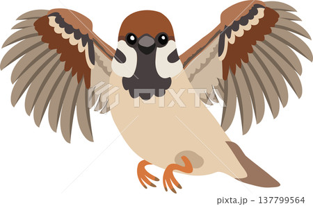 Cute small songbird with spread wings. House sparrow bird illustration showing motion and freedom