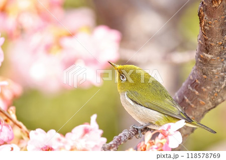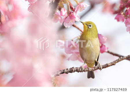 ピンク色の河津桜と可愛いメジロ