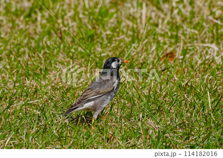 早春の枯れ草の中のつがいのムクドリ(椋鳥)
