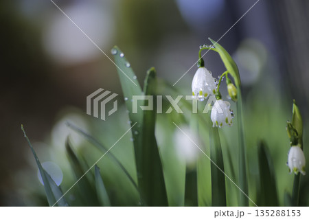 雫をまとったスノーフレーク 春の花 マクロ ぼけ背景