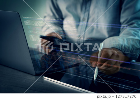 Programming code on representing person working laptop with digital code and tablet, using stylus, modern workspace, focused technology