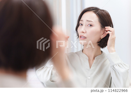 鏡を見て髪の毛を触るミドル女性(美容・ヘアセット・ヘアケア・髪の毛)