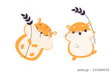 Cute Hamster Character with Stout Body Holding Spikelet Vector Set