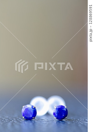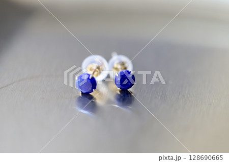 レザーの上に置いたラピスラズリの10Kスタッドピアス 青い天然石ジュエリー