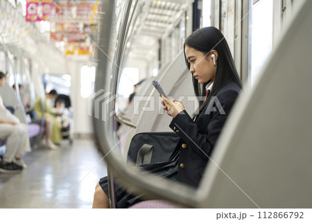 電車の中でスマートホンの画面を見る女子高校生 電車通学 イメージ