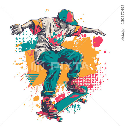 Street skateboarder illustration with colorful paint splashes and urban style. Extreme sports theme.