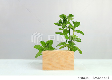 Abstract background with natural wooden podium and peppermint leaves, empty showcase for display or presentation of cosmetic products, minimal eco concept, selective focus.