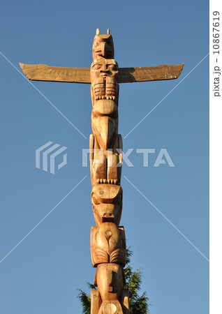 Totem wood pole in the blue cloudy background