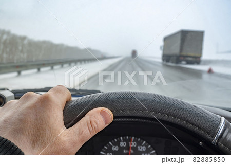 view of the driver hand on the steering wheel of the car while driving on a slippery snow covered road
