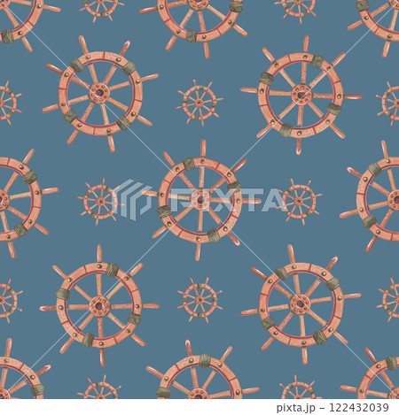 Watercolor illustration, seamless pattern with steering wheels. Simple, static, marine, beach. For fabric, textiles, clothing, poster, wallpaper, cover, print