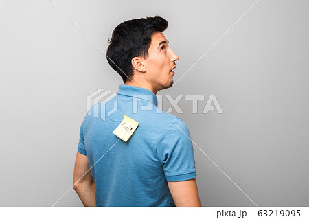 stupid looking man in blue shirt with a yellow sticky note with word fool on his back stupidly looking up