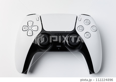 Realistic colorful video game joysticks or gamepads with color buttons on white background. 3D rendering of streaming gear for cloud gaming and gamer workspace concept