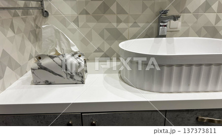 Minimalist bathroom countertop with marble tissue box beside white vessel sink and chrome faucet, geometric tile wall, clean spa-style interior