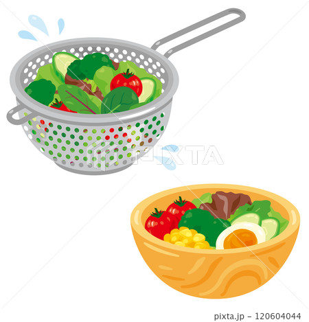 ザルで水切りされる野菜とボウルに盛られたサラダ