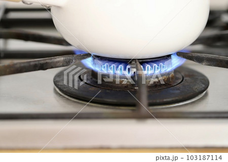 汚れた五徳のガスコンロ 小鍋を火にかけているところ