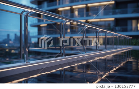 Sleek modern glass and stainless steel balcony railing illuminated at night with city view