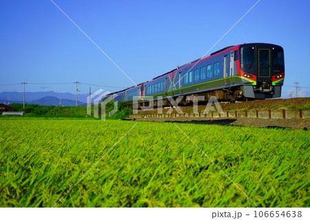 夏の朝 頭垂れる稲穂と青空の下、高松へ向かう特急うずしお4号