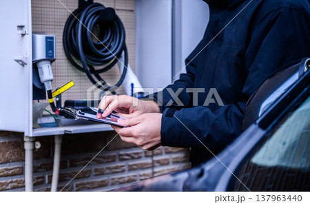 電気自動車 が 充電スタンド で バッテリー を チャージ する 【 EV の 充電 イメージ 】