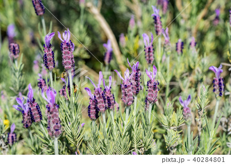 春の陽を浴びる薄紫色のフレンチラベンダーの花