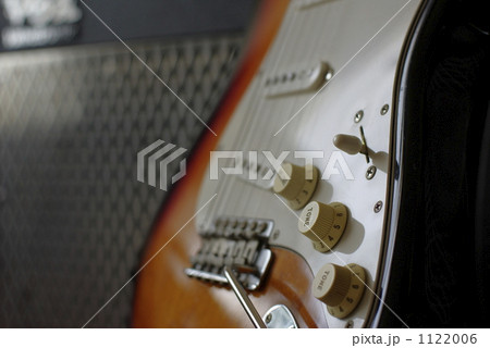 アンプが背景のストラトキャスター