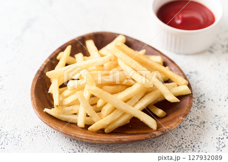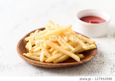ケチャップにつけて食べるフライドポテトのクローズアップ