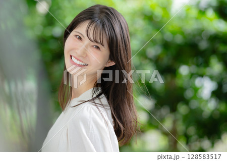 髪をなびかせながら心地よさそうに微笑む女性(茶髪)