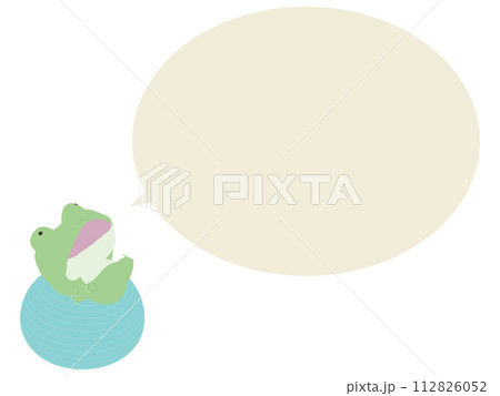 バランスボールに乗る笑顔のカエル。吹き出し付き