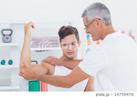 Doctor stretching a young man arm