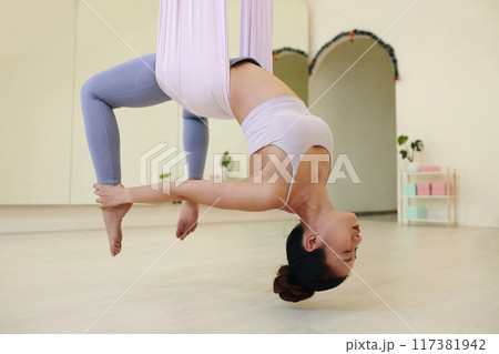 Practicing Aerial Yoga in Minimalist Studio Setting