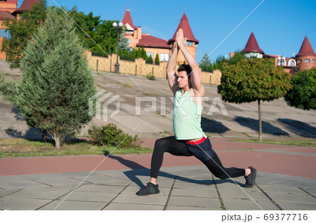 Male athlete, in summer in the city, stretching the muscles before jogging, fitness training