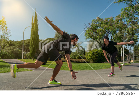 Fit fitness woman and man doing stretching exercises outdoors at city
