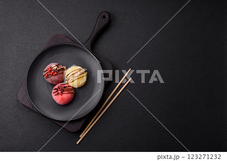 Delicious colorful asian mochi sweets with rice dough shell and fruit filling