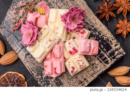 Multicolored handmade chocolate bars pink, white, brown colors