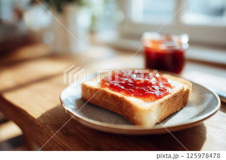 朝食のいちごジャムを塗ったトースト