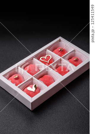 Delicious sweet mochi in the shape of red hearts