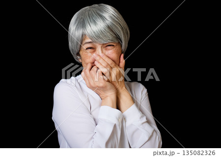 口元を両手で覆い感極まった表情の白髪のシニア女性