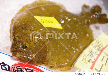 市場で売られる新鮮なカレイ
